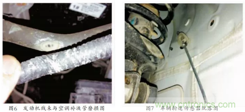 如下為兩種典型失效方式,圖6為發(fā)動機(jī)線束與空調(diào)補(bǔ)液管之間震動接觸造成的磨損,圖7為車輛輪速傳感器在運(yùn)動到極限位置時悶頭受力后脫落。綜上需嚴(yán)格控制線束在運(yùn)動包絡(luò)區(qū)域的布置,同時針對線束的磨損需遵循嚴(yán)格的評估標(biāo)準(zhǔn)。