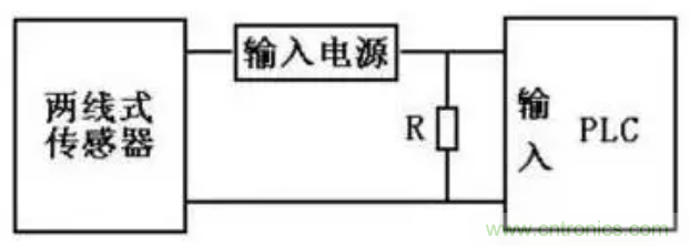 傳感器的種類很多,其輸出方式也各不相同。當采用接近開關(guān)、光電開關(guān)等兩線式傳感器時,由于傳感器的漏電流較大,可能出現(xiàn)錯誤的輸入信號而導(dǎo)致PLC的誤動作,此時可在PLC輸入端并聯(lián)旁路電阻R,如圖3所示。當漏電流不足lmA時可以不考慮其影響。