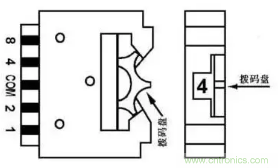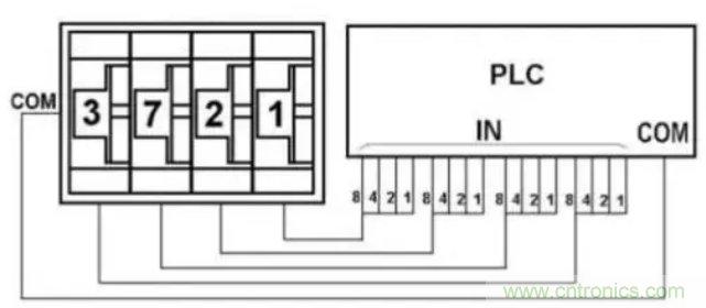 如果PLC控制系統(tǒng)中的某些數(shù)據(jù)需要經(jīng)常修改,可使用多位撥碼開關(guān)與PLC連接,在PLC外部進行數(shù)據(jù)設(shè)定。如圖4所示,為一位撥碼開關(guān)的示意圖,一位撥碼開關(guān)能輸入一位十進制數(shù)的0~9,或一位十六進制數(shù)的0~F。