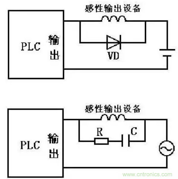 PLC的輸出端經(jīng)常連接的是感性輸出設(shè)備(感性負載),為了抑制感性電路斷開時產(chǎn)生的電壓使PLC內(nèi)部輸出元件造成損壞。因此當PLC與感性輸出設(shè)備連接時,如果是直流感性負載,應(yīng)在其兩端并聯(lián)續(xù)流二極管;如果是交流感性負載,應(yīng)在其兩端并聯(lián)阻容吸收電路。如圖6-10所示。