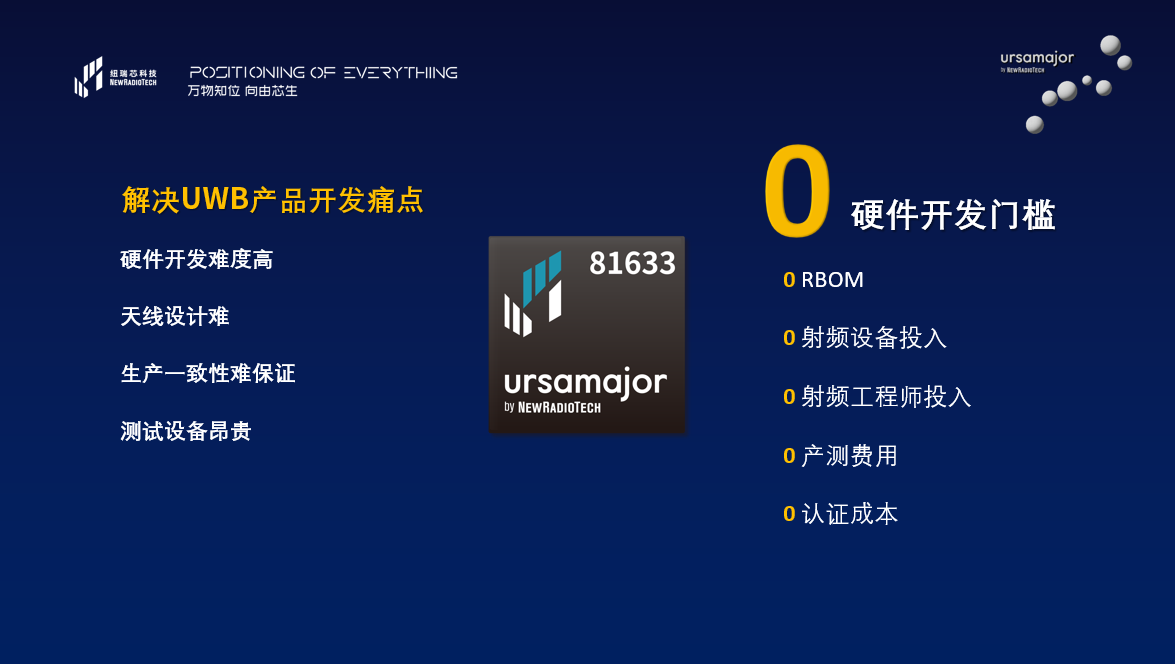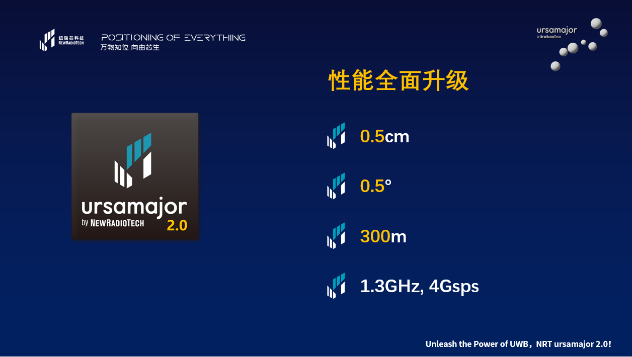 作為一家專(zhuān)注于無(wú)線(xiàn)通信技術(shù)芯片領(lǐng)域的先驅(qū)企業(yè),紐瑞芯始終致力于提供最優(yōu)質(zhì)、最高效的產(chǎn)品和解決方案。紐瑞芯在與合作伙伴密切合作的過(guò)程中,發(fā)現(xiàn)市場(chǎng)對(duì)UWB技術(shù)性能提升越來(lái)越急迫,且其應(yīng)用的范圍正在不斷延伸,場(chǎng)景越發(fā)豐富。這次發(fā)布的NRT ursamajor 2.0,是紐瑞芯深度挖掘了這些需求痛點(diǎn),對(duì)現(xiàn)有UWB技術(shù)產(chǎn)品進(jìn)行優(yōu)化和升級(jí)后的成果,旨在提供更加精確、穩(wěn)定、安全的定位通信服務(wù)。——Unleash the power of UWB!