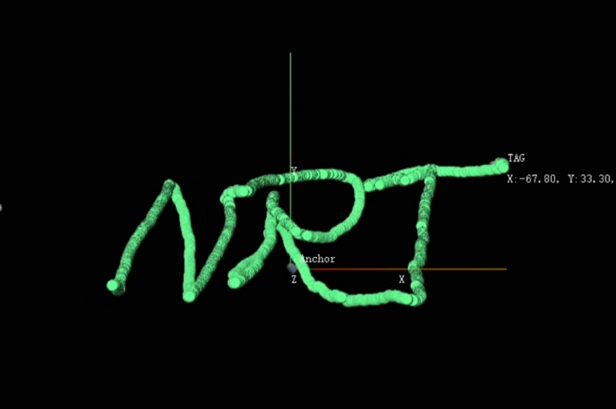 單點(diǎn)測(cè)角的誤差方差從1度縮小到0.5度左右,同時(shí)實(shí)現(xiàn)全空間測(cè)角和定位。實(shí)驗(yàn)中可以通過(guò)位移精確的寫(xiě)出文字,如下圖。