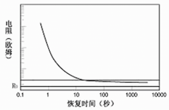 高分子PTC熱敏電阻由于電阻可恢復,因而可以重復多次使用。圖6為熱敏電阻動作后,恢復過程中電阻隨時間變化的示意圖。電阻一般在十幾秒到幾十秒中即可恢復到初始值1.6倍左右的水平,此時熱敏電阻的維持電流已經恢復到額定值,可以再次使用了。一般說來,面積和厚度較小的熱敏電阻恢復相對較快;而面積和厚度較大的熱敏電阻恢復相對較慢。