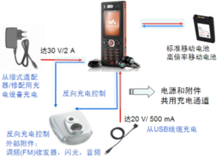 我們把普通墻式適配器或USB充電適配器到移動設備電池的通道稱為直接充電通道,而把移動設備電池到外部附件(如調(diào)頻收發(fā)器、負載揚聲器和閃光模塊)的通道稱為反向供電/充電通道(參見圖1移動設備的直接充電通道和反向供電/充電通道示意圖)。