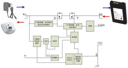 安森美半導體的NCP370是實現(xiàn)上述保護方案設想的業(yè)界首款集成型雙向保護器件,其功能模塊圖如圖2所示。其中,在針對直接充電通道的保護方面,新的NCP370提供高達+28 V的正向過壓保護和低至-28 V的負向過壓保護,顯著改善便攜設備的前端保護能力。同時NCP370還內(nèi)置過壓鎖定(OVLO)電路,在過壓條件下,只要輸入電壓超過OVLO閾值,輸出就會被關(guān)閉。NCP370集成了兩顆典型值為130 mΩ的低導通阻抗(Ron)的N溝道MOSFET(即NMOS),支持高達1.3 A的大充電電流。而從圖2中可以看出,NCP370采用了兩個背靠背(back-to-back)的NMOS。控制第1個NMOS的門極,可以消除直接充電通道的浪涌電流和正向過壓。