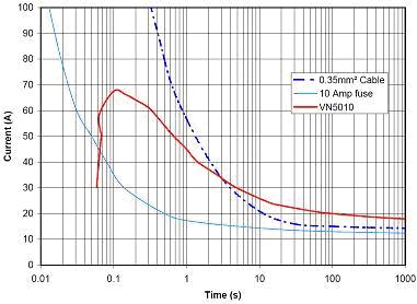 在圖5的示例中有一個(gè)點(diǎn),智能開(kāi)關(guān) (VN5010)將繼續(xù)前行,而電線將開(kāi)始自毀(紅線在藍(lán)色虛線上方)。如果這種情況是真實(shí)的,甚至連電路板都可能會(huì)自毀?,F(xiàn)在考慮到涌流要求很可能更加嚴(yán)格,我們開(kāi)始意識(shí)到有必要開(kāi)發(fā)一個(gè)能夠仿真熔斷器特性的保護(hù)算法。