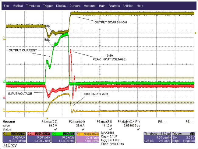 雖然器件在這硬件短路時幸免于難,但仍推薦選用一個更大的輸入旁路電容,以限制最大電壓,使其低于數據資料中規定的極限參數。