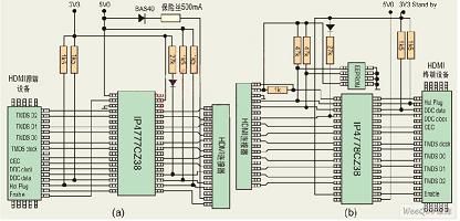 上面兩個圖分別給出了HDMI源設備的高集成度解決方案和HDMI終端設備的高集成度解決方案的電路示意圖。