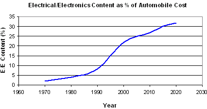 汽車電子和電器設備以平均每輛車每年超過110W的速度遞增,最近,過去由機械力和液壓力推動的系統都改由電力驅動,對電能的大部分需求都源于此。上世紀80年代出現的防抱死剎車系統(ABS)具有存儲容量大約為8KB電子控制單元;而現代的第五代ABS硬件配備128KB的存儲器,大小僅僅為早期系統的40%。由于設計精巧和創新,現代電氣/電子系統對功率的要求通常比最初推出的系統要小。