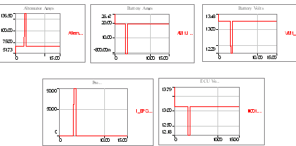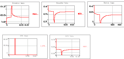 當EPS工作時,下圖描繪了上述電路引起的PowerNet瞬態波動。注意:當電力分配網絡穩定時,交流發電機提供給電池的最初充電電流。[page]