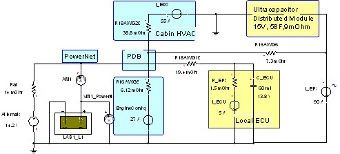 在上圖中,汽車充電系統由交流發電機和鉛酸電池來表示。在這種情況下,要利用Ansoft公司的汽車工具箱之中的Simplorer電化學建模工具對電池進行比較詳細的建模。PowerNet被高度簡化為由線規電阻建模的四個分支電路,包括引擎控制、車箱氣候控制、本地ECU和EPS(最右邊)。PowerNet分配點被標注為PDB或電力分配箱。