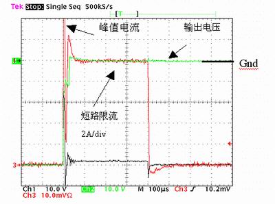如果我們采用一個32mΩ的NTB52N10T4、100V的FET及一個5mΩ的感應(yīng)電阻,在短路時FET的電流將被限制在10A,超過500μs斷路器就會關(guān)閉FET。圖2顯示-48V應(yīng)用中的短路波形。