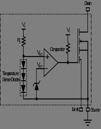 如果超過了最大結(jié)溫,該過熱保護電路會從SENSEFET將柵極驅(qū)動移除,此做法將使器件因關(guān)斷而受到保護。圖5表示過熱保護電路的簡單原理圖。當(dāng)結(jié)溫增加,感應(yīng)二極管的正向電壓下降,從而觸發(fā)比較器,因此功率SENSEFET的柵極驅(qū)動關(guān)斷。