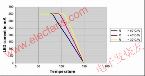 圖1中曲線顯示了1WLED的典型性能下降特性。正如所期望的那樣,這清楚地表明,被恒定電流驅(qū)動的LED在到達(dá)某一點后,該恒流需要線性地減少,直到在150℃這一點上達(dá)到0。恒流下降點和減小斜率取決于機械/散熱安排。