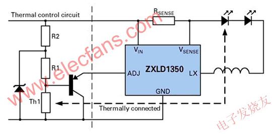 圖3顯示了一個典型的采用簡單熱控制的降壓穩(wěn)壓器例子。它的優(yōu)勢是利用了Zetex半導(dǎo)體公司ZXLD1350的ADJ引腳。通過使用一個PNP晶體管作為發(fā)射極跟隨器和使用該引腳的內(nèi)部250kΩ電阻作為負(fù)載來過驅(qū)該引腳,LED電流將與熱敏電阻成比例地下降。隨著溫度下降,熱敏電阻的阻值增加,但由于基準(zhǔn)(base)電壓增加超出了ADJ參考電壓,該晶體管就會關(guān)閉,LED僅獲得其最高設(shè)置電流,從而有效地鉗住低溫響應(yīng)。