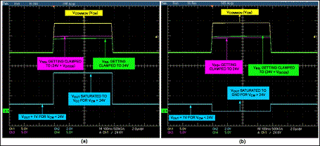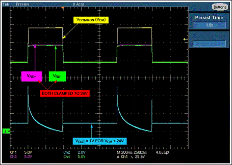 圖2是當(dāng)移走D1時(shí),35V拋負(fù)載脈沖下放大器的輸出。施加電壓為電池標(biāo)稱電壓,所要求的輸出電壓為1V (輸入VSENSE = 50mV、增益 = 20)。出現(xiàn)拋負(fù)載電壓時(shí),齊納管把輸入共模電壓鉗位在大約24V,放大器輸出經(jīng)過(guò)幾個(gè)短暫的波動(dòng)后穩(wěn)定到0V。