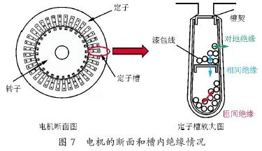 電機內部的斷面如圖7 所示。電機有定子和轉子,定子內有安放三相線圈的槽。如果放大槽的內部,可以看到有許多的線圈(漆包線),各線圈對地之間、各相之間、線匝相互之間都有絕緣存在。通常對地、相間都有絕緣紙插入,而線匝之間沒有絕緣紙插入,它利用堅固的漆包線的漆層獲得絕緣。微浪涌電壓給這些絕緣全部帶來影響,這些絕緣損壞之中,線圈匝間損壞最多。表1 列出了有關電機內部各絕緣部分承受的電壓值,也稱為電壓應力,提供了用市電電源驅動電機和用變頻器驅動時相比較的資料。