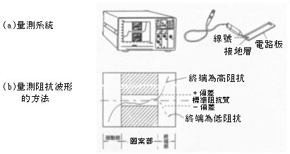 上述實驗用印刷電路板的阻抗Zo 是利用圖6的理論計算公式所獲得的計算結果,為了量測類似MHz等級電路板實際動作時阻抗值,因此利用圖7所示TDR(Time Domain Refrectometer)量測器檢測電路板的阻抗。TDR的動作原理是捕捉電波或是超音波撞擊物體后反彈的信號(echo)再將時差強弱圖像畫,依此量測結果如圖8所示。由圖可歸納下列三項結論: