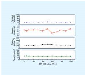基于硅的瞬態(tài)電壓抑制器件工作在標準P/N結的擊穿狀態(tài),相比基于聚合物-間隙(polymer- gapbased)的器件可提供相對低的觸發(fā)電壓和鉗位電壓。該類器件的泄漏電流比空氣間隙器件(air-gap device)的高10~20倍,其相對較高的固有電容導致高信號失真和插入損耗。基于空氣間隙的器件在以上討論過的所有技術中可提供最低的電容和鉗位電壓,其工作在兩個電極間的惰性氣體擊穿狀態(tài)。基于空氣間隙的器件可以防止高達15kV的脈沖,它們在經歷1000次脈沖沖擊后性能特點也相當穩(wěn)定(如圖2 所示)。基于空氣間隙的器件泄漏電流略高于基于聚合物-間隙的器件,但是其電容和插入損耗與聚合物器件相當或者稍好一些,并且其鉗位電壓和觸發(fā)電壓要低得多。