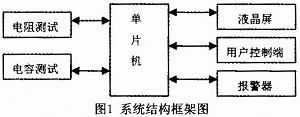 本文設(shè)計的電阻電容測試儀的系統(tǒng)結(jié)構(gòu)框架如圖1所示,系統(tǒng)主要由用戶控制端、單片機(jī)、液晶屏、電阻測試模塊、電容測試模塊、報警器以及其它附加功能模塊等組成。當(dāng)用戶需要測量某一電阻或電容的值時,只需要把此電阻或電容放在相應(yīng)的測試位置,選擇好量程,測試儀即可自動測出其電阻值或電容值,并把測試結(jié)果顯示在液晶屏上,方便用戶讀取。另外,此測試儀還具有超出量程警示功能和記憶功能,可存儲最近十次的測量結(jié)果。