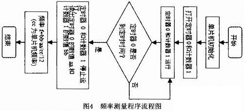 主要的子程序包括頻率測量子程序、鍵盤掃描子程序和數(shù)據(jù)存取子程序。頻率測量程序是系統(tǒng)軟件的核心,原理是用一個標(biāo)準(zhǔn)的頻率時鐘去計算被測的頻率,頻率測量程序流程圖如圖4所示。