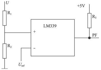 利用+ 5 V 及PF ( Power FAIL) 信號進行比較, 在+ 5 V 掉電時, PF 信號至少需維持10 ms 時間,以便存儲相關信息。欠壓保護電路如圖5 所示。