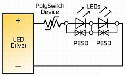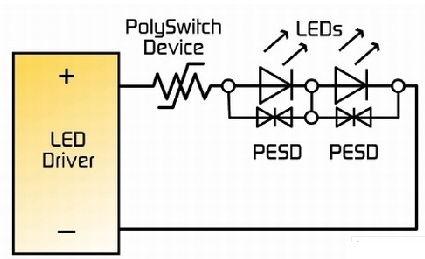 電源線耦合電壓瞬變和浪涌也可以降低LED的預(yù)期使用壽命,許多的LED驅(qū)動(dòng)器容易受到不合適的DC電壓水平和極性的破壞。LED驅(qū)動(dòng)器的輸出也可能被短路破壞或者摧毀。大多數(shù)LCD電視應(yīng)用的LED驅(qū)動(dòng)器包括內(nèi)置安全裝置,包括熱關(guān)閉以及開路、短路LCD檢測(cè)。然而,可能還需要另外的過流保護(hù)元件以幫助保護(hù)集成電路(IC)以及其它敏感的電子元件。PolySwitch元件也可以被用來幫助防止當(dāng)監(jiān)測(cè)器的冷卻口被堵塞時(shí)可能發(fā)生的熱失控情況。由于其具有對(duì)溫度過高的情況有檢測(cè)和反應(yīng)的能力,一個(gè)安裝合適的PolySwitch元件可以在LCD沒有足夠電壓運(yùn)行的情況下中斷電流。