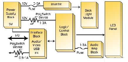 圖3顯示了在LCD電視監(jiān)測(cè)器中PolySwitch元件可以安放的位置,以幫助提供過電流保護(hù)。為了充分發(fā)揮PolySwitch元件的影響,可以將其和金屬芯電路板或者LCD散熱片熱結(jié)合在一起。如果LCD沒有內(nèi)置的ESD保護(hù),可以向ESD并聯(lián)一個(gè)PESD保護(hù)元件,以幫助避免由ESD電壓浪涌造成的破壞。