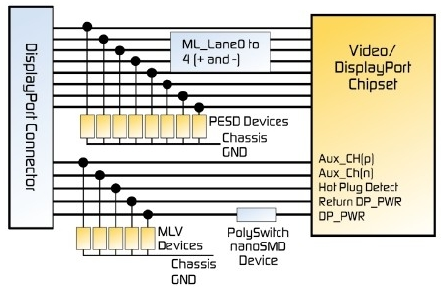 圖4. 典型的運(yùn)用MLV元件, PESD抑制元件以及PolySwitch過電流保護(hù)元件的顯示端口電路保護(hù)設(shè)計(jì)
