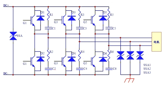 在集電極和發射極之間并接RC濾波電路,可有效地抑制關斷過電壓和開關損耗。但在實際應用中,由于DC電源前端的浪涌突波會使集電極過電壓,并使RC濾波電路部分的抑制效果生效,IGBT通常都會被擊穿或者短路。另外,在電機起動時,由于起動時的大電流,在主線路中分布的電感亦會造成較大程度的感應過電壓,使IGBT損壞。同時,電機勵磁造成的感應電動勢,對電路的破壞也相當地大——工程師們經常沒有考慮到這一點。