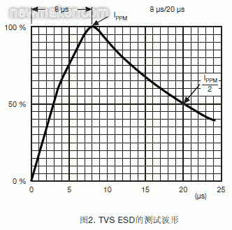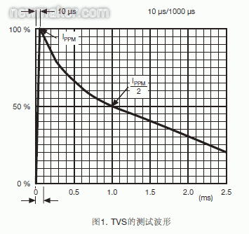 TVS的額定功率是在一定測試或應用條件下吸收浪涌的能力。10μs/1000μs脈沖波形的工業標準測試條件(Bellcore 1089標準)如圖1所示。這個測試條件不同于8μs/20μs脈沖波形的TVS瞬態電壓吸收能力測試條件,如圖2所示。