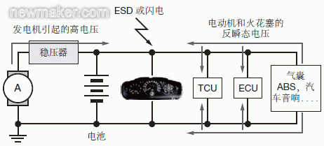 電子控制單元、傳感器和信息娛樂系統等汽車電子設備連接在一根電源線上(圖4)。這些電子產品的電源是電 池和交流發電機,這兩種電源的輸出電壓都不穩定,容易受溫度、工作狀態和其他條件影響。此外,使用燃油噴射系統、閥、電機、電氣和水解控制器等電磁線圈負 載的汽車系統,會把ESD、尖峰噪聲和其他類型的瞬態和浪涌電壓引入到電源和信號線上。