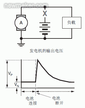 最糟糕的浪涌電壓發生在引擎運轉時電池斷開,交流發電機為汽車電源線提供電流時,這種情況就是所說的“甩負荷”。大多數汽車制造商和工業協會都會為這種甩負荷狀態制定最高電壓、線路阻抗和這種甩負荷狀態的持續時間,如圖5所示。甩負荷的電源阻抗會高于正常瞬態測試時的電源阻抗,因為電池斷開而只有發電機在向外輸出電能,這時交流發電機的內部線圈相當于一個限流電阻。