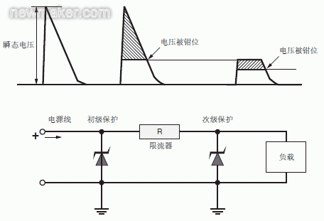 在電源線上增加電阻R可以減小瞬態電流,這樣就可以使用更小額定功率的TVS作為次級保護。電子單元中的微控制器和邏輯電路需要的電流為150mA~300mA,在-18℃下12V電池的最小輸出電壓為7.2V,同樣條件下,24V電池的最小輸出電壓為14.4V。同樣條件的24V電池中,在300mA負載、R=20Ω的條件下電源電壓為8.4V,在R=10Ω和14.4V的最低電壓(24V電池在-18℃時的電壓)條件下為11.4V。計算公式為:VL=(Vmin/(Vmin/IL))×((Vmin/IL)–R),其中,VL為負載電壓,Vmin為最小輸入電壓,IL為負載電流,R為電阻阻值,R的額定功率=I2R。