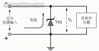 MOSFET的柵極在-1V或更低的反向電壓下也很脆弱。在反向電源輸入模式中,電源線電壓與TVS VF的電壓相同。這種反偏模式會引起電子線路故障。外延型TVS的低正向壓降能夠很好地解決這個問題。保護電路免受反向電源輸入損害的另一種方法是在電源線上使用一個極性保護整流器,如圖8所示。極性保護整流器應該有足夠的正向額定電流及正向浪涌和反向電壓性能。