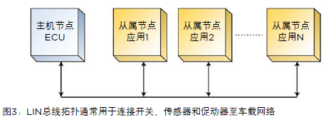 LIN總線拓?fù)淅靡慌_(tái)獨(dú)立主機(jī)或ECU(電子控制單元)以及多個(gè)節(jié)點(diǎn),如圖3所示。連接應(yīng)用模塊至車(chē)載網(wǎng)絡(luò)使其可進(jìn)行診斷和提供服務(wù)。