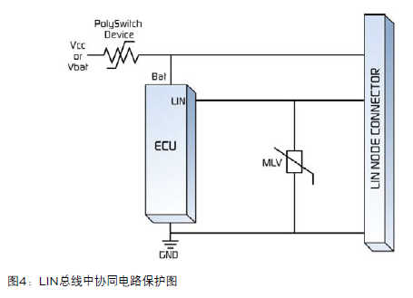 圖4為協(xié)同的電路保護(hù)圖,顯示出一個(gè)設(shè)置在功率輸入的可復(fù)位PolySwitch器件如何在電源輸入端保護(hù)ECU和LIN節(jié)點(diǎn)連接器免受過(guò)電流情況的損傷,以及一個(gè)MLV(多層電壓敏電阻器)如何為車(chē)載網(wǎng)絡(luò)應(yīng)用提供所需的高電流處理和能量吸收的過(guò)電壓保護(hù)。