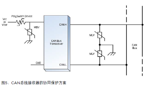 圖5顯示了如何在電源輸入端應(yīng)用可復(fù)位PolySwitch設(shè)備和MOV(金屬氧化電壓敏電阻器)從而避免因車(chē)載供電系統(tǒng)中心的浪涌電流和電壓異常而產(chǎn)生的損傷。