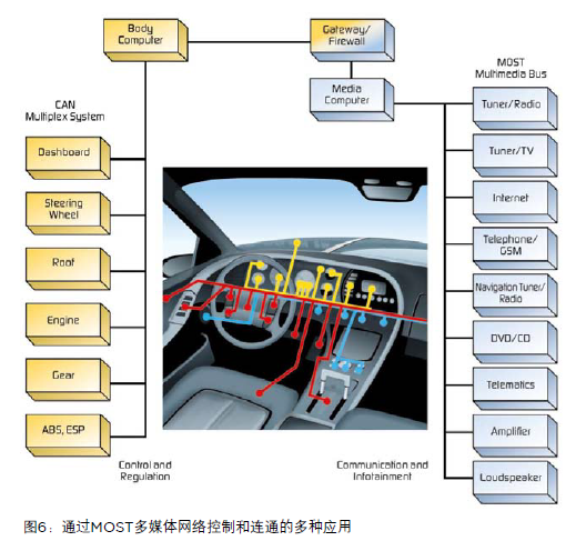 實(shí)際上,MOST是一個(gè)節(jié)點(diǎn)網(wǎng)絡(luò),用于傳輸車(chē)載多媒體和信息娛樂(lè)系統(tǒng)中出現(xiàn)的各種不同信號(hào)和數(shù)據(jù)流。MOST標(biāo)準(zhǔn)支持多種物理接口,如圖6所示。MOST標(biāo)準(zhǔn)中,這些應(yīng)用可參考功能塊。每個(gè)功能塊包括幾種功能(如一個(gè)CD播放器可以包括播放、停止、彈出和播放時(shí)間等功能)。