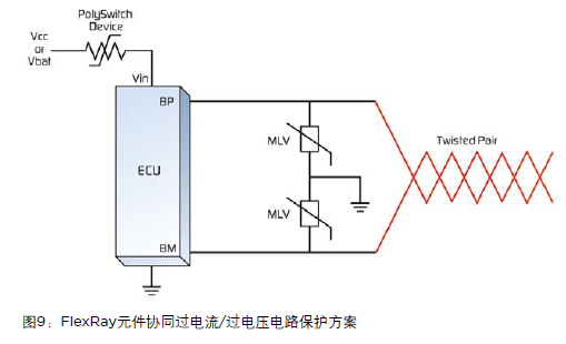 FlexRay協(xié)議專(zhuān)為線控應(yīng)用所設(shè)計(jì),如線控剎車(chē)和線控方向盤(pán)。該線控網(wǎng)絡(luò)方式支持同步和異步數(shù)據(jù)傳輸,數(shù)據(jù)傳輸率約為10Mb/s,具有時(shí)間觸發(fā)和事件觸發(fā)行為、冗位和容錯(cuò)的特點(diǎn)。該結(jié)構(gòu)支持一“束”2個(gè)節(jié)點(diǎn)至64個(gè)節(jié)點(diǎn),其功能主要依靠于兩種類(lèi)型的處理器—ECU和“活動(dòng)星”。FlexRay通訊通過(guò)一個(gè)常用總線或一個(gè)星形連接在ECU之間進(jìn)行。FlexRay元件的總線輸入必須避免在總線路和系統(tǒng)供電電壓或地電位之間出現(xiàn)短路現(xiàn)象。圖9顯示了ECU的調(diào)整后過(guò)電流/過(guò)電壓保護(hù)方案。該方案利用一個(gè)PolySwitch設(shè)備進(jìn)行過(guò)電流保護(hù),以及兩個(gè)傳統(tǒng)表面安裝結(jié)構(gòu)的MLV進(jìn)行ESD和瞬間過(guò)電壓保護(hù)。