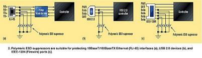 另外,商業(yè)化產(chǎn)品要求在所有不同的硬件接口位置都要有ESD浪涌保護(hù)。例如,一些新型電腦和更高端的消費(fèi)電子可能會(huì)如下這些互連器件的大部分或者全部:以太網(wǎng)、USB1.1/USB2.0、IEEE-1394/1394b、音頻/視頻/RF以及傳統(tǒng)的RS-232、RJ-11等端口等的audio/video/RF端口。所有傳統(tǒng)的保護(hù)器件都已經(jīng)不同程度地得以成功應(yīng)用。但是,如今不斷增長的工作頻率為超低電容器件(如聚合物抑制器)提出了需求(圖2a)。