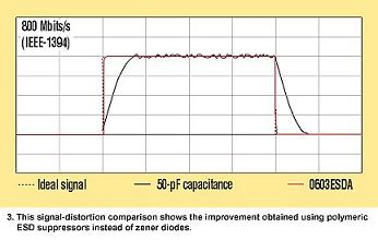 另外,許多新型消費(fèi)電子器件能執(zhí)行快速的IEEE-1394/1394b(Fireware)數(shù)據(jù)轉(zhuǎn)換協(xié)議。這種非常高的數(shù)據(jù)速率(1600 Mbps,1394b)要求低電容ESD抑制器,例如聚合物浪涌器件(圖 2c)。測試數(shù)據(jù)表明,聚合物ESD抑制器帶來的信號(hào)失真比硅二極管器件保護(hù)Firewire端口產(chǎn)生的更少(圖 3)。