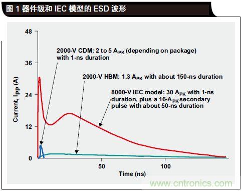 2、另一個差異存在于電壓尖峰上升時間。HBM 的規定上升時間為 25ns。IEC 模型脈沖上升時間小于 1ns,其在最初3ns 消耗掉大部分能量。如果 HBM 額定的器件需 25ns 來做出響應,則在其保護電路激活以前器件就已被損壞。