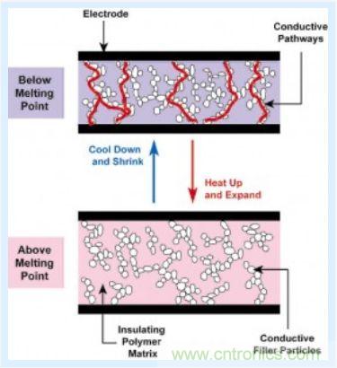 這是 PPTC 器件的工作原理,PPTC 器件是由一個由專業(yè)配方塑料和導電粒子混合而成的導電聚合物,如下圖所示,在正常溫度下,PPTC 器件中的導電粒子在聚合物中形成了低阻抗鏈。然而,如果溫度上升到器件的開關溫度之上,聚合物中的微晶體就會熔化而成為無定形狀態(tài)。晶體熔化過程中,體積會增加,引起導電粒子的分離,從而導致器件電阻呈現(xiàn)非線性增加。