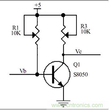2、當(dāng)我們調(diào)節(jié)可調(diào)電阻,R1,使R1=4.3K時(shí),通過(guò)歐姆定律我們可以計(jì)算得到,Ib=(5-0.7)/4.3K=1mA,那我們就可以計(jì)算出IC=Hfe*Ib=10mA,假如這個(gè)時(shí)候我調(diào)節(jié)R3,使R3=1K歐姆,通過(guò)計(jì)算我們可以得到Vc=5-(10mA*1K)=-5V,回出現(xiàn)-5V嗎,當(dāng)然不會(huì),因?yàn)闆](méi)有負(fù)壓,所以Vc的電壓會(huì)停留在0V,那這個(gè)時(shí)候我們?cè)賮?lái)看下Ic到底是多少?