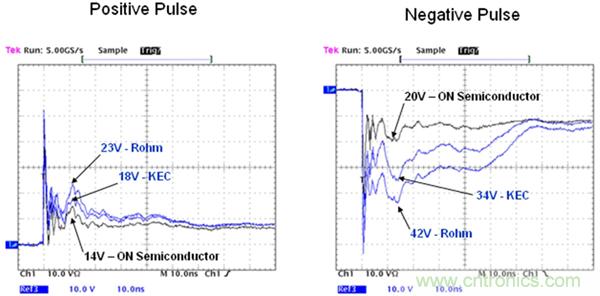 圖3:三種ESD保護(hù)二極管的鉗位電壓對比(示波器屏幕截圖)。