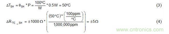 公式 3 可計算功率耗散所引起的電阻器溫度增加量 ΔTSH。公式 4 將 ΔTSH 插入公式 1 替代 ΔT,以確定 100°C/W 適度自發(fā)熱和 0.5W 功率耗散情況下自發(fā)熱所引起的電阻變化。