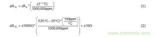 公式 1 和 公式 2 是溫度從 25°C 到 125°C 變化時,如何使用電阻器 TC 規(guī)范計算 1kΩ、±100ppm/°C 電阻器阻值 ΔRTC 變化的實例。