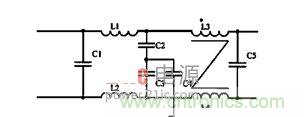 EMI濾波技術(shù)是一種抑制尖脈沖干擾的有效措施,可以濾除多種原因產(chǎn)生的傳導(dǎo)干擾。圖3是一種由電容、電感組成的EMI濾波器,接在開(kāi)關(guān)電源的輸入端。電路中,C1、C5是高頻旁路電容, 用于濾除兩輸入電源線間的差模干擾;L1與C2、C4;L2與C3、C4組成共模干擾濾波環(huán)節(jié),用于濾除電源線與地之間非對(duì)稱的共模干擾;L3、L4的初次級(jí)匝數(shù)相等、極性相反,交流電流在磁芯中產(chǎn)生的磁通相反,因而可有效地抑制共模干擾。測(cè)試表明,只要適當(dāng)選擇元器件的參數(shù),便可較好地抑制開(kāi)關(guān)電源產(chǎn)生的傳導(dǎo)干擾。