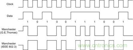 數字編碼采用曼徹斯特編碼,首先傳輸MSB(最高有效位)。曼徹斯特編碼:從高位轉移到低位(下降沿)為二進制1,從低位轉移到高位(上升沿)為二進制0,即圖 1的Manchester G.E.Thomas。